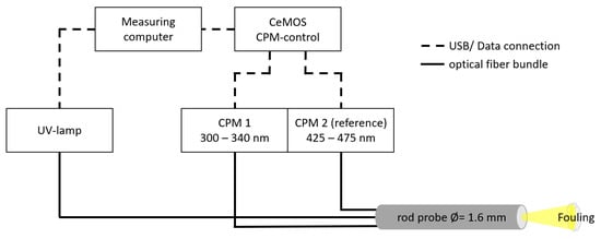 The first detection range lay at 320 nm and was limited by a bandpass filter (320/40 BrightLine HC) from Semrock (Rochester, New York, NY, USA), with a bandwidth of 40 nm. The corresponding CPM was the model CM92B, which had an increased sensitivity in the range of 165–650 nm. The second detection range was at 450 nm and was achieved by a bandpass filter (450/50 AT bandpass) from Chroma (Bellows Falls, VT, USA), with a bandwidth of 50 nm. The CPM installed behind it was of the model CM93LB and had an increased sensitivity in the range of 185–650 nm. The setup of the measurement system is shown schematically in Figure 2.