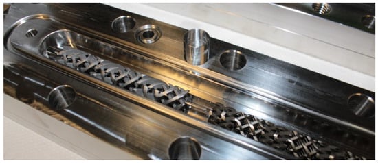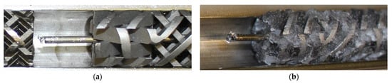 The reactor system consisted of one Fluitec ContiPlant half-shell reactor, shown in Figure 4, with an internal diameter of 12.3 mm and a length of 495 mm. Six mixing elements were placed in the reactor for each experiment. The operating run of each time was 8 h. The mixing elements were given a hole with a diameter of d = 1.6 mm. This hole allowed the rod probe to be passed through the mixers and the tip to be placed in the free space between two mixing elements. A 12.3 mm-wide sleeve guaranteed the distance between these mixing elements. In the experiments, the space between the last and penultimate mixing elements was chosen because this is where the most deposit formation occurred. The planar surface of a mixer served as a reflection surface. The probe tip was placed in the mixer from the reactor outlet (against the direction of flow) to allow as little fouling as possible on the probe tip.