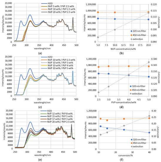 The first series of measurements at a constant PVP concentration (Figure 5a) shows in the range of 320 nm that an increase of the NVP concentration from 5 to 20 wt% leads to a signal drop of about 1000 counts. Calculated as absorbance in Figure 5b, this corresponds to an increase from 0.094 to 0.113.