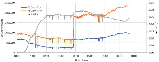 The series of measurements in the half-shell reactor took place at 85 °C and ran over a period of approx. 8 h. The CPMs each recorded a measured value every 5 s. For a monomer concentration of 20 wt%, and an initiator concentration of 0.02 wt%, the measured data are shown in Figure 6. The graphs of the 320 nm filter and the 450 nm filter are the raw data output from the CPMs. These two measurement curves were calculated according to the Lambert–Beer law (Equation (1)), as mentioned above. In Figure 6 the extinction was plotted together with the raw data. The advantages resulting from the processing were a reduction in noise, a reduction in the interference effects (e.g., compensation of the signal jump at 3:53) and the increased stability and reproducibility of the measurement data.