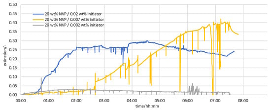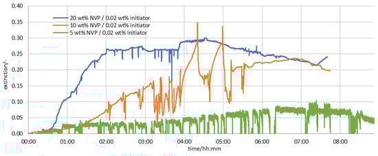 Figure 7 shows the extinction curves with a varying monomer concentration at 85 °C, and an initiator concentration of 0.02 wt%. A higher monomer concentration led to a higher extinction, and an earlier increase of the measured values. The interpretation of the results, considering Figure 5, suggests that an increase in extinction correlates with an increase in product, or a higher conversion, and a decrease in extinction correlates with a decrease in product, or a lower conversion.