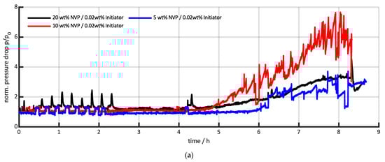 The pressure curve generally correlates with a clogging of the reactor by fouling. Figure 11a shows a stable pressure curve in the first 5 h for all concentrations and then an increase of the 10 wt% curve to a norm. pressure of 6 after approx. 6 to 8 h. For the 20 wt% curve, the increase is flatter and ends at a norm. pressure of 3.7 after approx. 8 h. The pressure of the 5 wt% curve increases after 6 h and has the lowest, final norm. pressure of 3 after approx. 2.5 h. The pressure increase from approx. the fifth hour is comparable to the drop in the extinction signal that occurs at about the same time in Figure 7. The disadvantage of the pressure measurement is, however, that in the first 5 h no statement can be made about the reaction progress, and, thus, no early detection is possible. In addition, the pressure curves do not provide a correlation between the monomer concentration and the signal maximum.