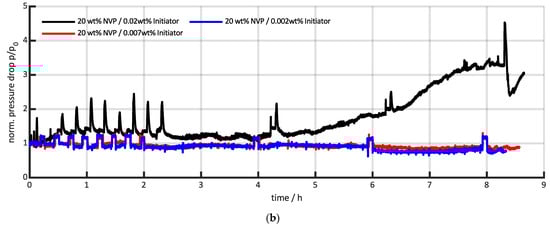 In Figure 11b, an increase in pressure can only be seen in the “20 wt% NVP/0.02 wt% Initiator” curve. This curve shows the same measurement as in Figure 11a. For the measurements with a 0.007 wt% and a 0.002 wt% initiator concentration, no pressure increase can be detected and therefore no statement about the reaction can be made. Comparing this with the extinction in Figure 10, a signal influence can be measured at least for the 0.007 wt% measurement series, which demonstrates the higher sensitivity of the spectroscopic measurement system.
