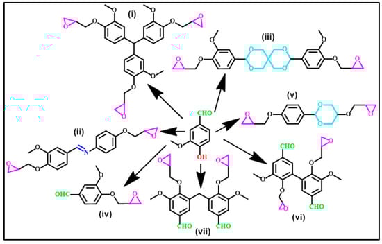 - Savonnet, E.; Grau, E.; Grelier, S.; Defoort, B.; Cramail, H. Divanillin-Based Epoxy Precursors as DGEBA Substitutes for Biobased Epoxy Thermosets. ACS Sustain. Chem. Eng. 2018, 6, 11008–11017. [Google Scholar] [CrossRef]