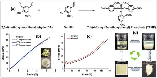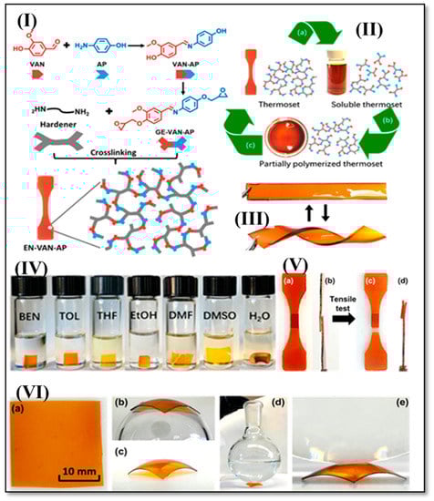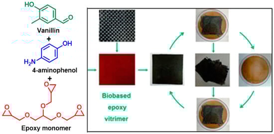 - Memon, H.; Liu, H.; Rashid, M.A.; Chen, L.; Jiang, Q.; Zhang, L.; Wei, Y.; Liu, W.; Qiu, Y. Vanillin-Based Epoxy Vitrimer with High Performance and Closed-Loop Recyclability. Macromolecules 2020, 53, 621–630. [Google Scholar] [CrossRef]