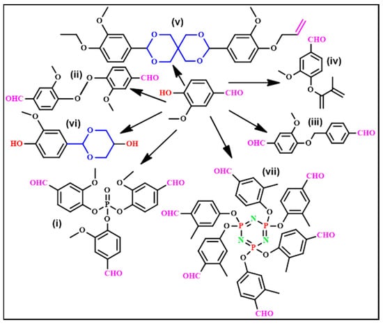 - Wang, S.; Ma, S.; Xu, C.; Liu, Y.; Dai, J.; Wang, Z.; Liu, X.; Chen, J.; Shen, X.; Wei, J.; et al. Vanillin-Derived High-Performance Flame Retardant Epoxy Resins: Facile Synthesis and Properties. Macromolecules 2017, 50, 1892–1901. [Google Scholar] [CrossRef]