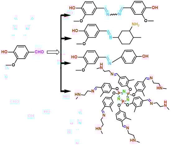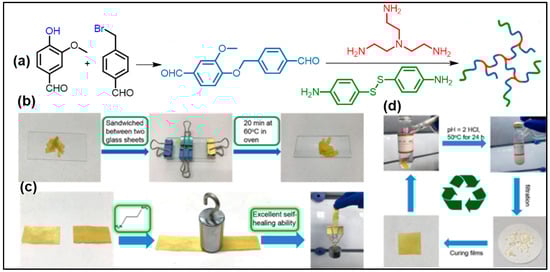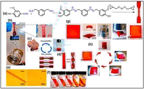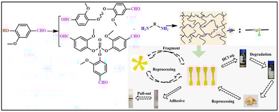 - Zhou, Z.; Su, X.; Liu, J.; Liu, R. Synthesis of Vanillin-Based Polyimine Vitrimers with Excellent Reprocessability, Fast Chemical Degradability, and Adhesion. ACS Appl. Polym. Mater. 2020, 2, 5716–5725. [Google Scholar] [CrossRef]