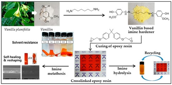 - Mai, V.D.; Shin, S.-R.; Lee, D.-S.; Kang, I. Thermal Healing, Reshaping and Ecofriendly Recycling of Epoxy Resin Crosslinked with Schiff Base of Vanillin and Hexane-1,6-Diamine. Polymers 2019, 11, 293. [Google Scholar] [CrossRef] [PubMed]