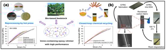 - Wang, Y.; Xu, A.; Zhang, L.; Chen, Z.; Qin, R.; Liu, Y.; Jiang, X.; Ye, D.; Liu, Z. Recyclable Carbon Fiber Reinforced Vanillin-Based Polyimine Vitrimers: Degradation and Mechanical Properties Study. Macromol. Mater. Eng. 2022, 307, 2100893. [Google Scholar] [CrossRef]