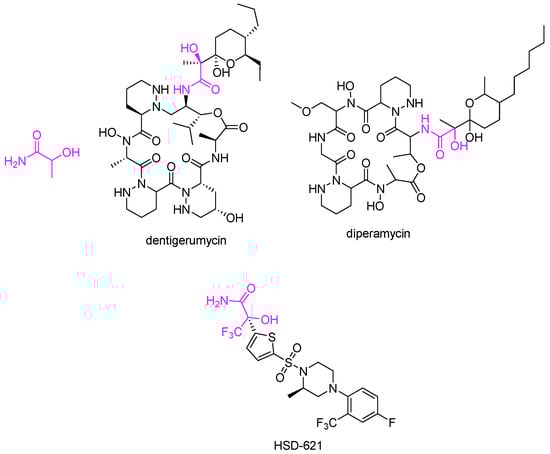 Hydroxypropanamide fragment, amide and sulfonamide pharmacophores in selected bioactive compounds.
