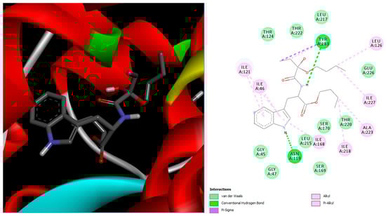 The binding energy, intermolecular energy, and Van Der Waals hydrogen bonding desolvation energy were used as parameters for evaluation of the potential behavior of compounds 1–36 as 11β-HSD1 inhibitors. The results showed that the compounds derived from L-tryptophan have the lowest values for binding energy (−8.82 to −9.97 kcal/mol), suggesting that this amino acid could be considered the primary precursor of protein inhibitors (Table 1). This can be explained considering the presence of the indole group that facilitates the interaction with the active site, which is not present in the other molecules evaluated. Furthermore, regarding the HOMO-LUMO gap parameter, it can be seen that this class of molecules also presents the lowest values, indicating that they can be chemically active, facilitating both nucleophilic and electrophilic reactions in the active site of the enzyme. However, these values may also suggest lower stability of these derivatives than the compounds designed from the amino acids L-alanine and L-phenylalanine (13–36).
