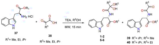 Understanding that L-tryptophan derivatives 1–12 were the objective molecules according to the in silico results, we set out to establish a synthesis method for these molecules. The synthesis of these compounds usually employs a sequence of hydrolysis and Passerini reactions under ultrasound irradiation, using trifluoroacetophenones and isonitriles in acetic acid as starting reagents []. However, this synthetic method is not practical using 2-aminoacids as substrates. We performed an alternative synthesis method which is presented using this type of starting reagents. In this article, we presented the synthesis of 2 as model of the reaction, which was prepared by a convergent synthesis from precursor 37 and 38. Precursor 37 was obtained via esterification of L-tryptophan [] using SiMe3Cl. Several preliminary amidation reaction experiments were carried out to obtain the optimized variables such as temperature, time, stoichiometric ratio, and influence of the substituents. The reaction between these precursors only occurs in basic medium, under temperatures close to 150 ° C under microwave irradiation (Scheme 1). The desired hydroxypropanamide compounds (1–2, 5–6) were obtained using low molecular weight alcohols such as methanol and ethanol as the reaction medium. However, when the reaction was carried out in higher molecular weight alcohols, such as isopropanol, the major products were 39 and 40 with a moderate to high yield. In alcohols of higher molecular weight, no compounds other than the precursors were detected. These results suggest that the amidation reaction is kinetically favored under microwave irradiation conditions and that, subsequently, the presence of small alcohols (such as methanol and ethanol) leads to a subsequent reaction, in which the formation of a compound of the hemiacetal type takes place. When isopropanol is used, a transesterification and subsequent amidation initially occur, but the attack on the carbonyl group is not favored, so the hemiacetal described above is not formed.