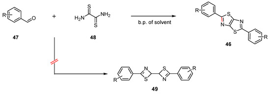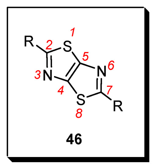 - Papernaya, L.K.; Shatrova, A.A.; Sterkhova, I.V.; Levkovskaya, G.G.; Rozentsveig, I.B. Microwave-Assisted Synthesis of 2,5-Diarylthiazolo[5,4-d]thiazoles from benzaldehydes and dithioxamide. Russ. J. Org. Chem. 2015, 51, 389–393. [Google Scholar] [CrossRef]