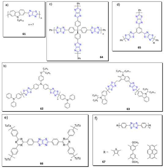 - Zhu et al. (2014) [99] demonstrated the preparation of a porous cross-linked polymer 64 (Figure 11c) containing TzTz and phenyl units. Similar phenyl-based monomers with three carbaldehyde groups, such as tris(4-formylphenyl)-benzene and tetra(4- formylphenyl)-benzene, can be also condensed with dithiooxamide to give a cross-linked copolymer with a porous structure [100].