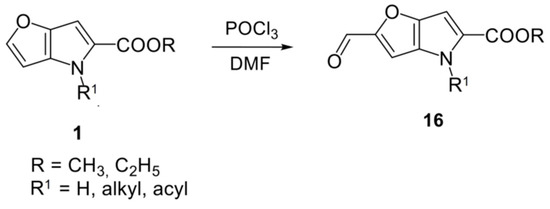- Kralovičová, E.; Krutošíková, A.; Kováč, J.; Dandárová, M. Electrophilic substitution reactions of furo[3,2-b]pyrrole derivatives. Collect. Czech. Chem. Commun. 1986, 51, 106–111. [Google Scholar] [CrossRef]