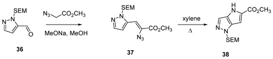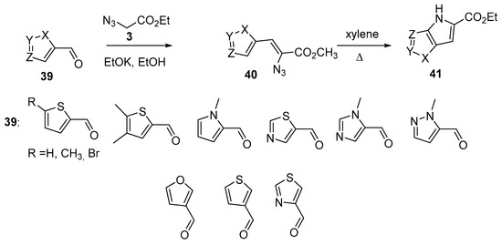 - Hemetsberger, H.; Knittel, D. Syntheses and Thermolyzen von α-Azidoacrylestern. Monatsh. Chem. 1972, 103, 194–204. [Google Scholar] [CrossRef]