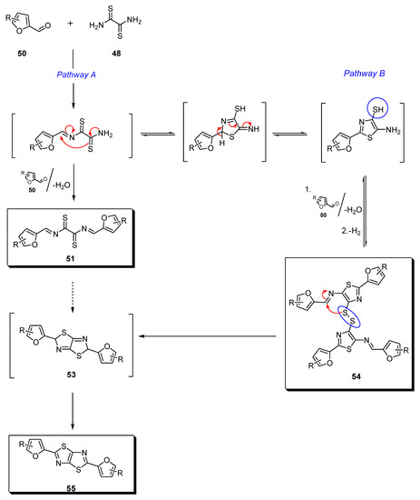 - Tokárová, Z.; Eckstein-Andicsová, A.; Balogh, R.; Tokár, K. Survey of the Ketcham reaction for series of furan-substituted thiazolo[5,4-d]thiazoles. Tetrahedron 2021, 89, 132155. [Google Scholar] [CrossRef]