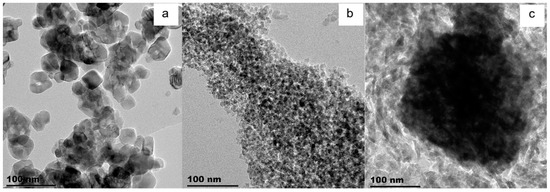TEM results for the fresh supported catalysts taken at 100 nm for all samples (a) TiO2; (b) SiO2; and (c) Al2O3.
