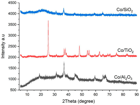 XRD results for the fresh supported catalysts after calcination: Co/SiO2; Co/TiO2; and Co/Al2O3.