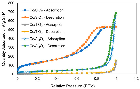 The BET isotherms for nitrogen adsorption and desorption obtained with the cobalt-based catalysts are shown in Figure 3. The SiO2-supported catalyst with the highest BET surface area (407.0 m2/g), Figure 3, can be classified as type IV, according to the IUPAC classification. Type IV corresponds to mesoporous materials, which is corroborated by the presence of the hysteresis loop (H1 type according to IUPAC classification). The H1 type represents porous materials that consist of well-defined cylindrical pore channels or agglomerates of uniform spheres [30]. This is in line with the spherical cobalt nanoparticles deposited on the SiO2 support observed via TEM (Figure 1b) and with the amorphous silica structure observed via XRD (Figure 2). Another study observed the type IV isotherm for SiO2 and modified SiO2 with chelating agents [28], which was attributed to the mesoporous SiO2 material. The TiO2- and Al2O4-supported catalysts, Figure 3, respectively, correspond to the type III IUPAC classification for macroporous materials [30]. The TiO2 and Al2O3 type III IUPAC classification reflects on the broader pore size distribution, see Table 1.