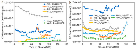 The FTS reaction was conducted in a fixed-bed microreactor at 220 °C and 20 bars for all catalyst samples. The performance parameters recorded after reaching a steady state are provided in Figure 4, Figure 5 and Figure 6. The SiO2-supported catalyst reduced in H2 exhibited the highest CO reaction rate at a lower reduction temperature (250 °C) (Figure 4a), while the TiO2-supported catalysts reduced in H2 showed higher activity at 350 °C with respect to SiO2- and Al2O3-supported catalysts. (See Figure 4b).