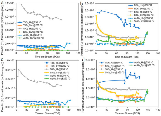 The TiO2-supported catalyst was not as active as the SiO2 catalyst at 250 °C, but it showed the best performance when the catalyst reduced in H2 at 350 °C (Figure 4b). This may be attributed to the encapsulation of metallic Co by TiO2−x as a result of the lower surface free energy of the latter and may suggest the wetting of TiO2 by CoO [6]. It is well known that spherical Co metal is the active phase for FTS [31]. Therefore, the cubic shape might have lowered the amount of Co-CoOx phase formed on the low surface area TiO2. The FTS reaction is shape-sensitive and -selective, so the spreading of the CoOx on the surface of the cubic TiO2 particles might have been deposited on one side only. Figure 5 shows the formation rate of ethane (P2) and butane (P4) paraffinic products against time on stream. The TiO2 catalysts showed higher paraffin selectivity at 350 °C than SiO2 and Al2O3. This can be attributed to transport restrictions imposed by the physical structure of the support and by a high Co site density within the catalyst pellets, which increases the residence time and the re-adsorption probability of reactive α-olefins, thus leading to a higher yield of paraffinic products. The TiO2 catalyst was more selective to olefins when reduced at a lower temperature, see Figure 6a,c. A low reduction temperature leads to incomplete reduction of the Co3O4. Our previous research [21] indicates that reducing at 250 °C in H2 results in a mixture of Co3O4, CoO, and Co and that reducing in syngas, produces a mixture of Co3O4, CoxC, CoO, C, and sometimes Co0 Furthermore, cobalt oxides are reported to favor the production of short-chain hydrocarbons [4]; therefore, the TiO2 catalyst was more selective to olefins due to incomplete reduction and a high mass percentage of cobalt oxides.