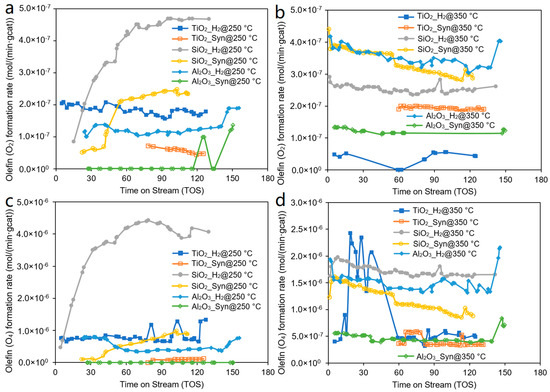 Olefin formation rates with TOS at different reduction temperatures and at a GHSV of 3600 Nml/h/gCat: (a) Ethene (O2) when the catalysts reduced in H2 or syngas at 250 °C; (b) O2 when the catalysts reduced in H2 or syngas at 350 °C; (c) butene (O4) when the catalysts reduced in H2 or syngas at 250 °C; and (d) O4 when the catalysts reduced in H2 or syngas at 350 °C.