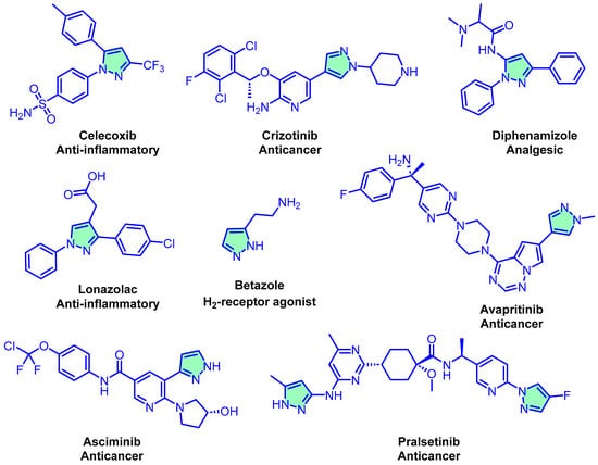 Over the past decade, there has been a significant increase in interest in pyrazole chemistry, primarily driven by the discovery of fascinating properties demonstrated by numerous pyrazole derivatives. The term “pyrazole” was initially discovered by Ludwig Knorr in 1883 [1], while Edward Buchner is recognized as the first to synthesize it in 1889 [2]. Pyrazoles, as five-membered heterocycles, belong to a class of compounds highly valued in organic synthesis. Within the azole family, they are among the most extensively studied groups of compounds. Over the years, a vast array of synthesis methods and synthetic analogues have been documented, highlighting their significant importance in research and applications [3]. Furthermore, the pyrazole fragment plays a crucial role in numerous organic ligands and serves as an essential coordinator. Recent research has uncovered intriguing applications of the pyrazole structure in organic synthesis, where it acts as both a directing and transforming group [4,5]. Pyrazole serves as a fundamental element present in various small molecules, exhibiting a diverse array of agricultural and pharmaceutical activities [3]. Specifically, they are classified as inhibitors of protein glycation, exhibiting properties such as anti-inflammatory, antibacterial, antifungal, anticancer, antidiabetic, antioxidant, antidepressant, anti-tuberculosis, and antiviral activities [3,6,7,8]. Additionally, certain pyrazoles find applications in supramolecular and polymer chemistry, in the food industry, and are utilized as cosmetic colorings [8]. In recent years, a number of FDA-approved and commercially available drugs, both patented and non-patented, have been formulated using pyrazole derivatives [9] (Figure 1). This trend highlights the extensive utilization of these groups in the creation of novel bioactive compounds. This review provides a succinct overview of pyrazole pharmacophore synthesis, making it a valuable reference guide for researchers exploring this field. The review is loosely organized into chemical synthesis categories.