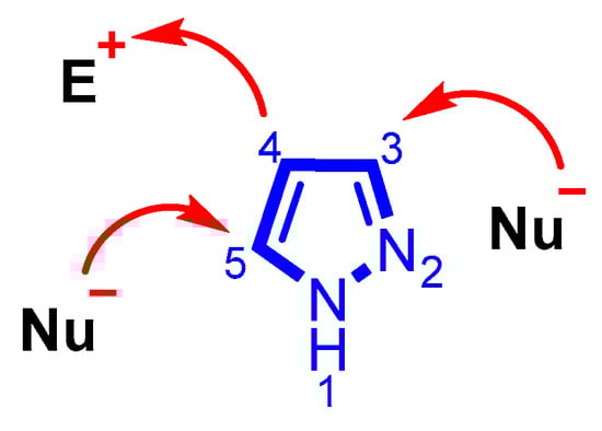 Pyrazole, as an aromatic heterocycle with π-electron excess, displays distinct reactivity patterns in organic chemistry. Nucleophilic attacks are favored at positions 3 and 5, while electrophilic substitution reactions preferentially take place at position 4 [10] (Figure 2).