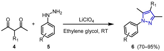 Konwar et al. [11] established an eco-friendly procedure for synthesizing pyrazole derivatives, employing lithium perchlorate as a Lewis acid catalyst. Initially, they react with acetylacetone and 2,4-dinitriphenylhydrazine as a model to determine the optimized reaction conditions. At first, they attempted the reaction solely with solvents, without adding any catalyst, but it did not proceed at all, highlighting the need for a catalyst. The synthetic pathway consisted of the reaction of hydrazines 5 with 1,3-diketones 4 in the presence of ethylene glycol. Pyrazoles 6 were afforded in good to excellent yields (70–95%) at room temperature (Scheme 2, Table 1).