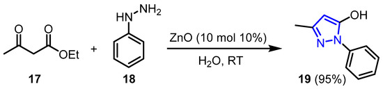 Girish et al. [15] conducted a remarkable study where they introduced a highly efficient and environmentally friendly approach using nano-ZnO catalyst for synthesizing 1,3,5-substituted pyrazole derivatives 19. The process involved the condensation of phenylhydrazine 18 with ethyl acetoacetate 17 under controlled conditions (see Scheme 6). The key advantages of this method include its exceptional yield, reaching an impressive 95%, short reaction time, and straightforward work-up procedure. The combination of excellent yield, short reaction time, and ease of handling makes this method a promising and valuable addition to the field of pyrazole derivative synthesis.