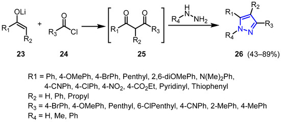 In their study, Heller and Natarajan [17] introduced a highly innovative approach to the synthesis of pyrazoles in situ. The process involved the direct synthesis of 1,3-diketones 25 from ketones 23 and acid chlorides 24, which were subsequently transformed into pyrazoles 26 by the addition of hydrazine in good to excellent yields (see Scheme 8). This approach exhibits exceptional speed, generality, and chemoselectivity, enabling the synthesis of pyrazoles that were previously inaccessible, along with challenging pyrazole-containing fused rings. The fusion of rapidity, generality, and chemoselectivity in this approach makes it a valuable asset in the arsenal of synthetic chemists, opening new avenues for the creation of diverse pyrazole-based compounds with enhanced complexity and utility.