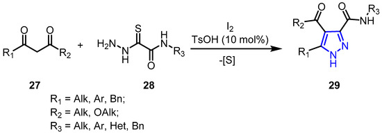 Komendantova and her team work devised an innovative method for the synthesis of 3,4-dicarbonyl-substituted pyrazoles 29 [18]. This approach involves the use of a broad array of 1,3-dicarbonyl compounds 27 and oxamic acid thiohydrazides 28 in an iodine-promoted cascade imination/halogenation/cyclization/ring contraction reaction in the presence of catalytic amounts of TsOH, accompanied by sulfur elimination (see Scheme 9). The result is a highly efficient and straightforward route to functionalized pyrazoles, utilizing readily available substrates and mild reaction conditions.