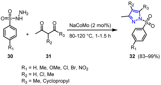 Yan et al. [19] made a remarkable discovery by uncovering a new metal-oxo-clusters-based inorganic framework called “3D platelike ternary-oxo-cluster” (NaCoMo), which serves as an efficient catalyst for generating novel pyrazole derivatives. Moreover, this catalyst exhibits exceptional catalytic activity in the condensation and cyclization reaction of sulfonyl hydrazides 30 and 1,3-diketones 31 to synthesize the pyrazoles 32, leading to an impressive yield of up to 99% for the desired product (see Scheme 10). The successful synthesis of NaCoMo signifies the introduction of a new type of non-classical polyoxometalates.