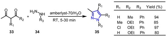 Chandak and his collaborators documented an environmentally friendly and efficient aqueous synthesis of pyrazoles 35 via the condensation of hydrazines or hydrazides 34 with 1,3-diketones 33 at room temperature, utilizing Amberlyst-70 as the catalyst (see Scheme 11) [20]. This innovative protocol benefits from the use of resinous, nontoxic, thermally stable, and cost-effective Amberlyst-70 as a heterogeneous catalyst, in addition to offering a simple reaction workup, thus presenting valuable eco-friendly attributes.