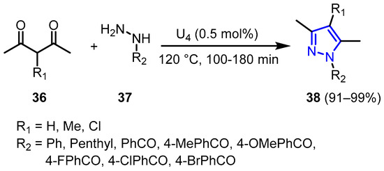 Liu et al. [21] made an exciting discovery of a novel Keggin-based U-POW (U(VI)-containing polytungstates) tetramer, referred to as U4. This tetramer showcased remarkable bifunctional Lewis’s acid-base catalytic properties and exhibited excellent performance in the synthesis of pyrazoles 38 via the condensation of diverse hydrazines 37 with 1,3-diketones 36 under mild reaction conditions (see Scheme 12). This groundbreaking work not only presents a rare case of tetrameric U-POWs but also highlights the application of U-POWs in catalytic synthesis chemistry, potentially advancing the fields of POM (actinide-containing polyoxometalates) chemistry, actinide chemistry, and catalytic chemistry.
