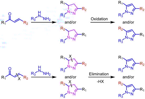 As a general trend, the condensation of hydrazines with R-enones predominantly yields pyrazolines in a regioselective manner. Subsequently, to acquire the corresponding pyrazoles, these pyrazolines must undergo oxidation (see Scheme 13).