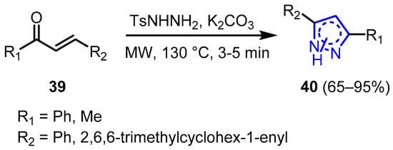 The Corradi group conducted a study under microwave irradiation and solvent-free reaction conditions, wherein they successfully synthesized novel 3,5-disubstituted-1H-pyrazoles 40 [22] (see Scheme 14). This was achieved via the cycloaddition of tosylhydrazones and α,β-unsaturated carbonyl compounds containing a β-hydrogen 39. The cycloaddition reaction was investigated using three different ketones: trans-4-phenyl-3-buten-2-one, β-ionone, and trans-chalcone. Notably, the corresponding 3,5-disubstituted-1H-pyrazoles 40 were obtained in high yields and with short reaction times. To assess the environmental impact, the proposed synthetic route was compared to the classical synthetic route, aiming to provide a reliable methodology and tool for measuring their ecological implications.