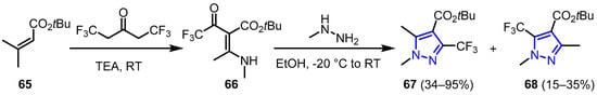 Iminov and his colleagues devised a method to obtain the pyrazole moiety. It consists of the acylation of tert-butyl 3-(methylamino)but-2-enoate 65 using fluorinated acetic acid anhydrides at the enamine carbon atom [30]. Subsequently, the resulting product 66 was reacted with alkyl hydrazines, leading to mixtures of isomeric pyrazoles. These mixtures were separated via column chromatography to provide compounds 67 and 68, yielding moderate to poor results in terms of yields (see Scheme 22).