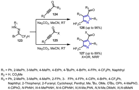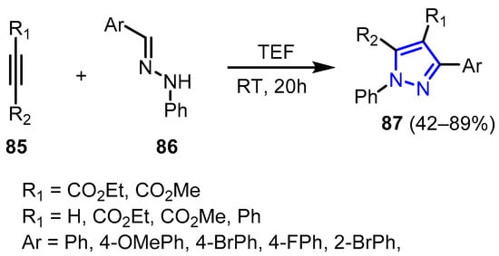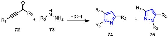 The formation of pyrazoles via the cyclocondensation reaction of hydrazine derivatives 73 with acetylenic ketones 72 has been a well-known process for over a century [32]. However, despite its long-standing recognition, the reaction continues to yield a mixture of two regioisomers, namely 74 and 75 (as shown in Scheme 24).