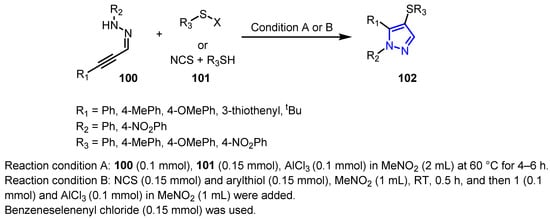 - Yu, X.; Shang, Y.-Z.; Cheng, Y.-F.; Tian, J.; Niu, Y.; Gao, W.-C. Synthesis of 4-chalcogenyl pyrazoles via electrophilic chalcogenation/cyclization of α,β-alkynic hydrazones. Org. Biomol. Chem. 2020, 18, 1806–1811. [Google Scholar] [CrossRef]