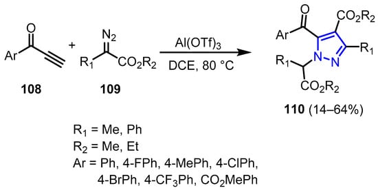 - Topchiy, M.A.; Zharkova, D.A.; Asachenko, A.F.; Muzalevskiy, V.M.; Chertkov, V.A.; Nenajdenko, V.G.; Nechaev, M.S. Mild and Regioselective Synthesis of 3-CF3-Pyrazoles by the AgOTf-Catalysed Reaction of CF3-Ynones with Hydrazines. Eur. J. Org. Chem. 2018, 2018, 3750–3755. [Google Scholar] [CrossRef]