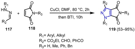- Zhu, J.-N.; Wang, W.-K.; Jin, Z.-H.; Wang, Q.-K.; Zhao, S.-Y. Pyrrolo[3,4-c]pyrazole Synthesis via Copper(Ι) Chloride-Catalyzed Oxidative Coupling of Hydrazones to Maleimides. Org. Lett. 2019, 21, 5046–5050. [Google Scholar] [CrossRef]