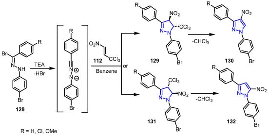 Kula et al. [47] in 2022 explored the experimental and theoretical studies on the reaction between (E)-3,3,3-trichloro-1-nitroprop-1-ene 112 and N-(4-bromophenyl)-C-arylnitrylimine 128. The title process led to the formation of the corresponding pyrazoles 130 and 132 (see Scheme 41).