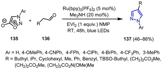 Lakeland and his research team reported a regioselective reaction achieved via a visible-light photoredox process, employing Ru(bpy)3(PF6)2 as the catalyst [49] (as depicted in Scheme 43). This innovative approach enabled the synthesis of a wide range of 1,4-disubstituted pyrazoles 137 with excellent yields.