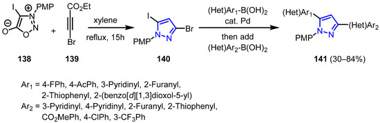 Delaunay et al. [50] presented a significant research study on the [3 + 2] dipolar cycloaddition of 4-halosydnones with 1-haloalkynes, offering a straightforward route to access 3,5-dihalopyrazoles. These dihalopyrazoles serve as valuable scaffolds for generating unsymmetrically 3,5-substituted pyrazole derivatives via site-selective Pd-catalyzed cross-coupling reactions. For instance, they demonstrated the flexible introduction of different (hetero)aryl substituents at the C-5 and C-3 positions of the PMP-protected pyrazole nucleus in a one-pot operation, utilizing sequential reactions with various boronic acids (as depicted in Scheme 44). This method offers a versatile strategy for the synthesis of diverse pyrazole derivatives.
