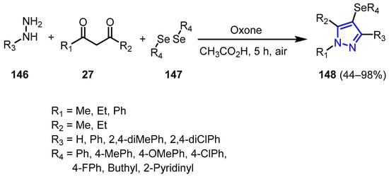 In another study, Jacob and colleagues presented an exceptionally efficient one-pot procedure to synthesize 4-organylselanylpyrazoles 148 by means of direct cyclocondensation and C-H bond selenylation reactions. This method commences with hydrazines 146, 1,3-diketones 27, and diorganyl diselenides 147, employing Oxone as the promoting agent. The products were obtained using a metal catalyst-free approach, operating under mild conditions, leading to short reaction times, and yielding products in moderate to excellent yields [52] (see Scheme 46).