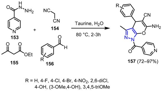 In 2021, Mali and colleagues introduced an efficient and environmentally friendly multicomponent approach, catalyzed by taurine, for the synthesis of densely substituted therapeutic core dihydropyrano[2,3-c]pyrazoles 157 [54] (see Scheme 48). This pioneering method enabled the synthesis of a diverse array of 1,4-dihydropyrano[2,3-c]pyrazoles, incorporating isonicotinamide, spirooxindole, and indole moieties. The application of these synthetic strategies and technologies led to the creation of novel compounds.