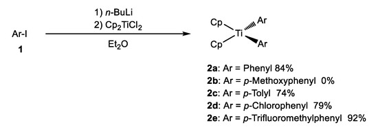 Bis(cyclopentadienyl)diaryltitanium 2 was synthesized according to the procedures specified in previous reports [27,28]. Aryl iodide 1 was treated with 1.0 equivalents of n-butyllithium in dry ether under an argon atmosphere at −30 °C, followed by dichlorobis(cyclopentadienyl)titanium (Cp2TiCl2), thus resulting in the formation of 2a–e in good-to-excellent yields (Scheme 1). Unfortunately, the use of the methoxy derivative, with a stronger electron-donating group on its benzene ring compared to the methyl group, yielded only a complex mixture, not 2b. The resulting products, whose color ranged from yellowish to dark red, were crystalline compounds that were stable at room temperature in air.