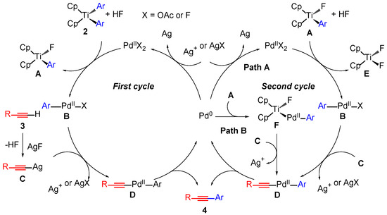 The mechanism of the Sonogashira-type reaction with diaryltitanocenes 2 is currently unclear. We considered mechanisms similar to those described in our previous study [22]. Plausible mechanisms for the reaction between terminal alkynes and diaryltitanocenes in the formation of internal alkynes are shown in Scheme 2. The first step of the reaction was the transmetallation between diaryltitanocene (2) and the PdIIX2 catalyst to form intermediates A and B. Silver acetylide C and HF were formed from terminal alkyne 3 and AgF. A second transmetallation of B with silver acetylide C afforded intermediate D, which underwent a reductive elimination to form coupling product 4 and a Pd0 species. The Pd0 species was oxidized by the silver cation or AgX to regenerate PdII (Scheme 2, first cycle). Subsequently, the ligand-exchange reaction of intermediate A with the PdIIX2 catalyst generated intermediate B, followed by the reaction of B with C to afford D. Intermediate D was converted to 4 via a reductive elimination (Scheme 2, second cycle). Another route in the second cycle is possible, in which the oxidative addition of A to Pd0 affords PdII intermediate F.
